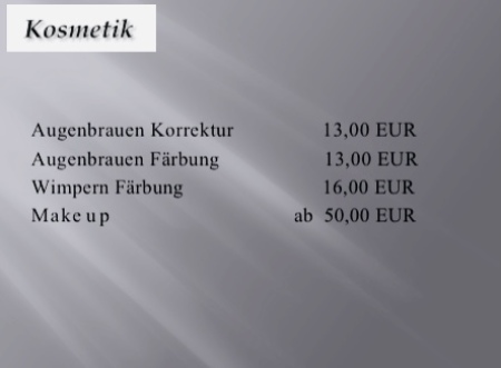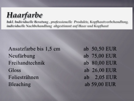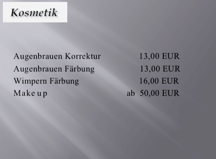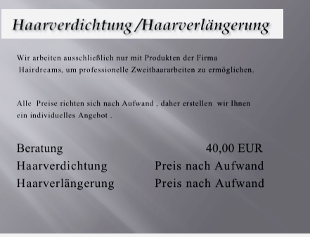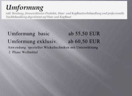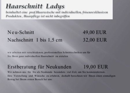 Besondere Terminwünsche ,z.B.außerhalb der Öffnungszeiten, werden mit 100%igen Aufschlag berechnet. Unsere Mitarbeiterinnen werden Sie gern beraten und informieren.